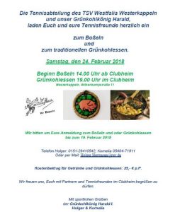 Die Tennisabteilung und unser Grünkohlkönig laden herzlich zum Boßeln und zum traditionellen Grünkohlessen ein.
