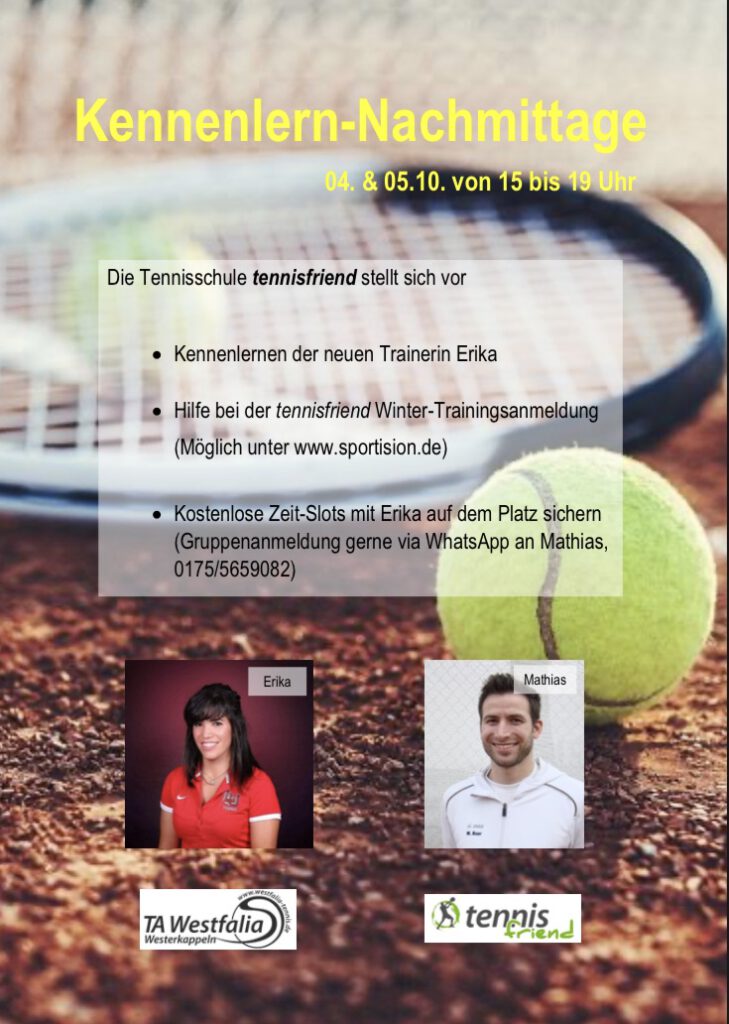 wie bereits angekündigt haben wir in der nächsten Woche die Gelegenheit, die Tennisschule tennisfriend an zwei Nachmittagen kennenzulernen.